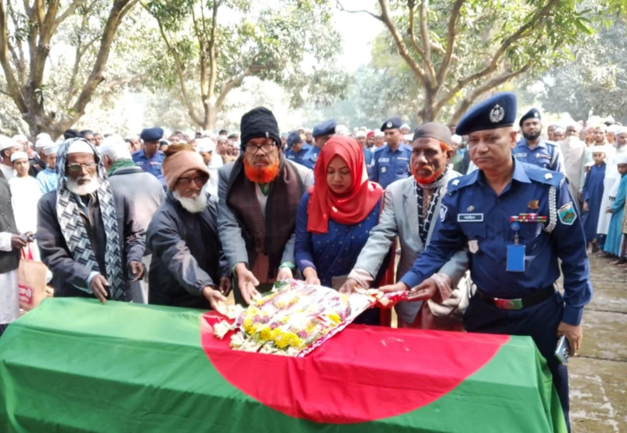 স্টাফ রিপোর্টার: চাঁপাইনবাবগঞ্জের ভোলাহাট উপজেলার হাজীপাড়া গ্রামের বীর মুক্তিযোদ্ধা শাহাজাহান আলী মৃত্যুবরণ করেছেন। ১৩ জানুয়ারি সোমবার রাত ৭টা ২০ মিনিটের সময় নিজ বাড়িতে শেষ নিঃশ্বাস ত্যাগ করেন। বীর মুক্তিযোদ্ধার পিতার নাম মৃত রস্তুম আলী। মৃত্যুকালীন তাঁর বয়স হয়েছিল ৬৮ বছর। তিনি স্ত্রী ২ ছেলে ও ১ মেয়েসহ অসংখ্য গুণগ্রাহী রেখে গেছেন। তাঁকে ১৪ জানুয়ারি মঙ্গলবার দুপুর ১২টার সময় পোল্লাডাঙ্গা কবরস্থানে উপজেলা নির্বাহী অফিসার ও ভারপ্রাপ্ত উপজেলা মুক্তিযোদ্ধা কমান্ডার তাহমিদা আক্তারের নেতৃত্বে একটি চৌকস পুলিশ দল বীর মুক্তিযোদ্ধাকে রাষ্ট্রিয় মর্যাদা প্রদান করে দাফন সম্পন্ন করে। পুলিশ দলের নেতৃত্ব প্রদান করেন অফিসার ইনচার্জ ওসি মোঃ শাহিনুর রহমান।