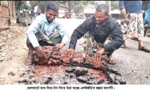 নাম প্রকাশে অনিচ্ছুক এলজিইডি অফিসের একজন বলেন, ডব্লিউ বিএম পানি দিয়ে ভালোভাবে ডলে তেল দেওয়ার পরে কার্পেটিং করতে হতো। এগুলো ভালোভাবে না করার জন্য কার্পেটিং উঠে যাচ্ছে। ওয়ার্ক এ্যাসিস্ট্যান্ট মো. আনোয়ার হোসনে বলেন, আমাকে কাজরে জন্য রাতে ডেকেছিল। আমি রাতে আসেনি। অন্য কিছু বলতে পারবো না।