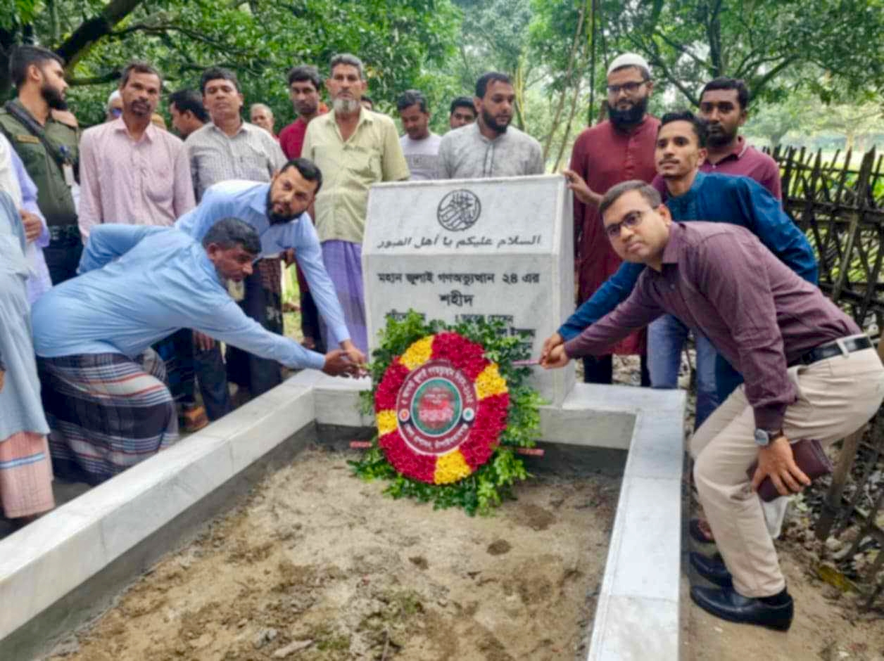 গোমস্তাপুর উপজেলা প্রশাসনের আয়োজনে মঙ্গলবার সকাল আটটার দিকে চৌডালা ইউনিয়নের ইসলামপুর গোরস্থানে শহিদ তারেকের সমাধিতে জেলা প্রশাসক ও বিজ্ঞ জেলা ম্যাজিস্ট্রেট চাঁপাইনবাবগঞ্জ মোঃ আব্দুস সামাদ, পুলিশ সুপার রেজাউল করিম, বিপিএম-সেবা ও উপজেলা নির্বাহী কর্মকর্তা (ইউএনও) জাকির মুন্সী সহ শহিদ তারেকের বাবা আসাদুল ইসলামকে সঙ্গে নিয়ে পুষ্পস্তবক অর্পণ করেন। এ সময় অন্যদের মধ্যে উপস্থিত ছিলেন অতিরিক্ত জেলা প্রশাসক (রাজস্ব) ইফতেখারুল ইসলাম, অতিরিক্ত জেলা প্রশাসক ( শিক্ষা ও আইসিটি) আনিসুর রহমান, অতিরিক্ত পুলিশ সুপার গোমস্তাপুর সার্কেল হাসান তারেক, অফিসার ইনচার্জ গোমস্তাপুর থানা ওয়াদুদ আলম সহ জেলা ও উপজেলার উদ্ধতন কর্মকর্তা, সুশীল সমাজ, সামাজিক, সাংস্কৃতিক ও ক্রীড়া সংগঠক, প্রিন্ট ও ইলেকট্রনিক মিডিয়ার সংবাদকর্মী, বৈষম্যবিরোধী ছাত্রনেতা সহ শিক্ষার্থীরা। পুষ্পস্তবক অর্পণ শেষে শহিদ তারেকের বিদেহী আত্মার মাগফেরাত কামনায় মোনাজাত করা হয়।