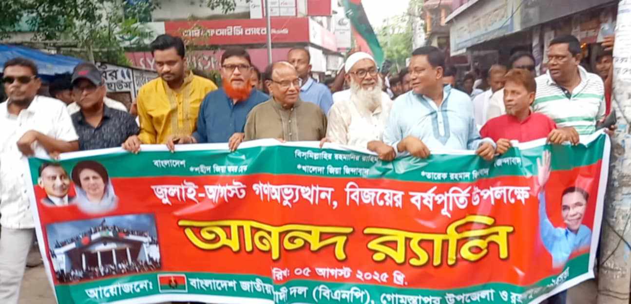 নুর মোহাম্মদ,গোমস্তাপুর :চাঁপাইনবাবগঞ্জের গোমস্তাপুরে জুলাই-আগস্ট গণঅভ্যুত্থান বিজয়ের বর্ষপূর্তি উপলক্ষে বিএনপির আনন্দ র্যালি ও আলোচনা সভা অনুষ্ঠিত হয়েছে।এ উপলক্ষে মঙ্গলবার বিকেলে রহনপুর পৌর এলাকার উপজেলা চত্বর মরহুম বাইরুল চেয়ারম্যানের চাটাল হতে আনন্দ র্যালি বের হয়ে রহনপুর পৌর এলাকার প্রধান প্রধান সড়ক প্রদক্ষিণ শেষে একই স্থানে আলোচনা সভা অনুষ্ঠিত হয়।এতে সভাপতিত্ব করেন উপজেলা বিএনপির( ভারপ্রাপ্ত) সভাপতি মোয়াজ্জেম হোসেন।এ সময় প্রধান অতিথি হিসেবে উপস্থিত ছিলেন, জেলা বিএনপির আহ্বায়ক গোলাম জাকারিয়া।প্রধান বক্তা হিসেবে উপস্থিত ছিলেন, উপজেলা বিএনপির সদস্য সচিব ও চাঁপাইনবাবগঞ্জ-২ আসনে বিএনপির মনোনয়ন প্রত্যাশী অ্যাডভোকেট নুরুল ইসলাম সেন্টু, ও রহনপুর পৌর বিএনপির আহবায়ক এনায়েত করিম তৌকি।বিশেষ অতিথি হিসেবে উপস্থিত ছিলেন, বাঙ্গাবাড়ি ইউনিয়ন বিএনপির সভাপতি রফিকুল ইসলাম রাজ,গোমস্তাপুর ইউনিয়ন বিএনপির সভাপতি আব্দুল্লাহ আল রাইহান,সাধারণ সম্পাদক মার্জুক আহমেদ, রাধানগর ইউনিয়ন সাধারণ সম্পাদক শামিউল ইসলাম বাবুল, চৌডালা ইউনিয়ন বিএনপির সভাপতি মুন্তাজ আলী, ইঞ্জিনিয়ার এম ফেরদৌস ইসলাম খোকন,রহনপুর পৌর বিএনপির যুগ্ম আহবায়ক সাদিকুল ইসলাম,রহনপুর পৌর বিএনপি সদস্য সচিব ইসমাইল হোসেন, বিএনপি নেতা সাজ্জাদ, বিপ্লবী যুবনেতা রবিউল ইসলাম, ছাত্রনেতা মুরসালিন, নাফিস প্রমূখসহ গোমস্তাপুর উপজেলা শাখা ও রহনপুর পৌরসভা শাখা বিএনপি যুবদল ছাত্রদলের সকল পর্যায়ের নেতৃবৃন্দ।