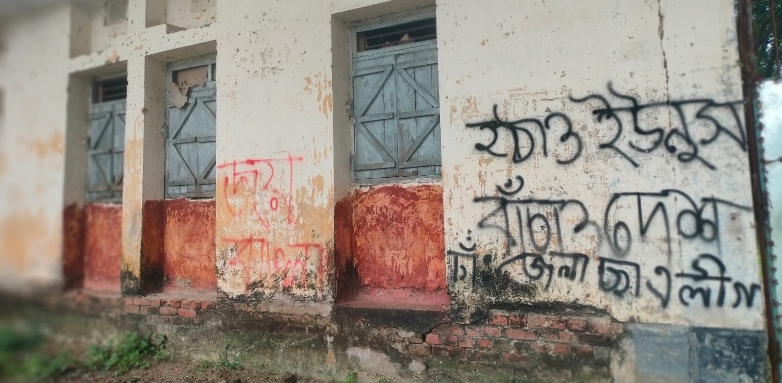 স্টাফ রিপোর্টার: চাঁপাইনবাবগঞ্জের ভোলাহাট উপজেলায় শিক্ষা প্রতিষ্ঠানের দেয়ালে ‘জয় বাংলা ও সরকার বিরোধী’ বিভিন্ন লেখা দেখা গেছে। তবে রাতের আধারে কারা এসব লিখেছে, সে বিষয়টি নিশ্চিত হওয়া যায়নি। শুক্রবার (৮ আগষ্ট) সকাল থেকে ভোলাহাট রামেশ্বর পাইলট মডেল ইনস্টিটিউশন-এর দেয়ালে কয়েক জায়গায় লেখা স্লোগান সাধারণ মানুষের নজরে আসে।