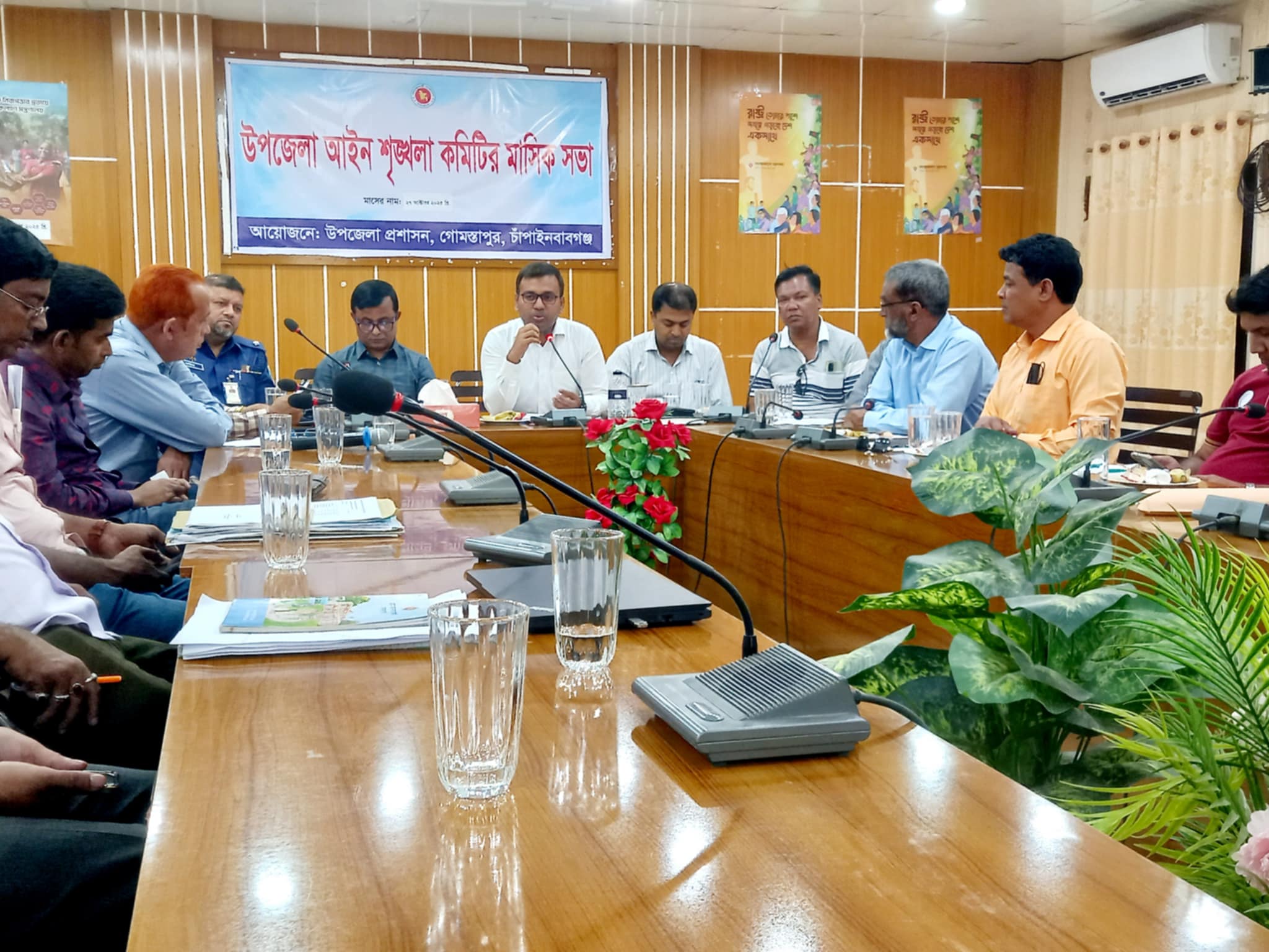 ব্যুরো প্রধান,গোমস্তাপুর:চাঁপাইনবাবগঞ্জের গোমস্তাপুরে আইন শৃঙ্খলা কমিটির মাসিক সভা অনুষ্ঠিত হয়েছে।সোমবার সকাল সাড়ে দশটায় উপজেলা সভাকক্ষে এই সভা অনুষ্ঠিত হয়। উপজেলা নির্বাহী কর্মকর্তা (ইউএনও) জাকির মুন্সীর সভাপতিত্বেসভায় বক্তব্য রাখেন , রহনপুর তদন্ত কেন্দ্রের অফিসার ইনচার্জ ফরিদউজ্জামান,উপজেলা এলজি ই ডি অফিসার আছহাবুর রহমান, প্রাথমিক শিক্ষা অফিসার ইসাহাক আলী, প্রাণিসম্পদ কর্মকর্তা , ওয়াসিম আকরাম, সমাজসেবা কর্মকর্তা জাহাঙ্গীর আলম, স্বাস্থ্য ও পরিবার পরিকল্পনা কর্মকর্তা আব্দুল হামিদ,আলীনগর ইউনিয়ন পরিষদের চেয়ারম্যান আবুল কালাম মোহাম্মদ মাসুম,রহনপুর ইউনিয়ন চেয়ারম্যান মনিরুজ্জামান সোহরাব,চৌডালা চেয়ারম্যান গোলাম কিবরিয়া হাবিব, বোয়ালিয়া চেয়ারম্যান সামিউল আলম শ্যামল,রহনপুর রিপোর্টার্স ক্লাব এর সভাপতি আব্দুল্লাহ আল মামুন নাহিদ,গোমস্তাপুর স্মার্ট প্রেস ক্লাবের সাধারণ সম্পাদক সামিরুল ইসলাম, উপজেলার সকল দপ্তরের প্রধানগণ, প্রিন্ট ও ইলেকট্রিক মিডিয়ার সাংবাদিকবৃন্দ। মাসিক সভায় আইন শৃঙ্খলাসহ উপজেলার সার্বিক বিষয়ে আলোচনা ও পদক্ষেপ গ্রহণের বিষয়ে আলোচনা করা হয়।