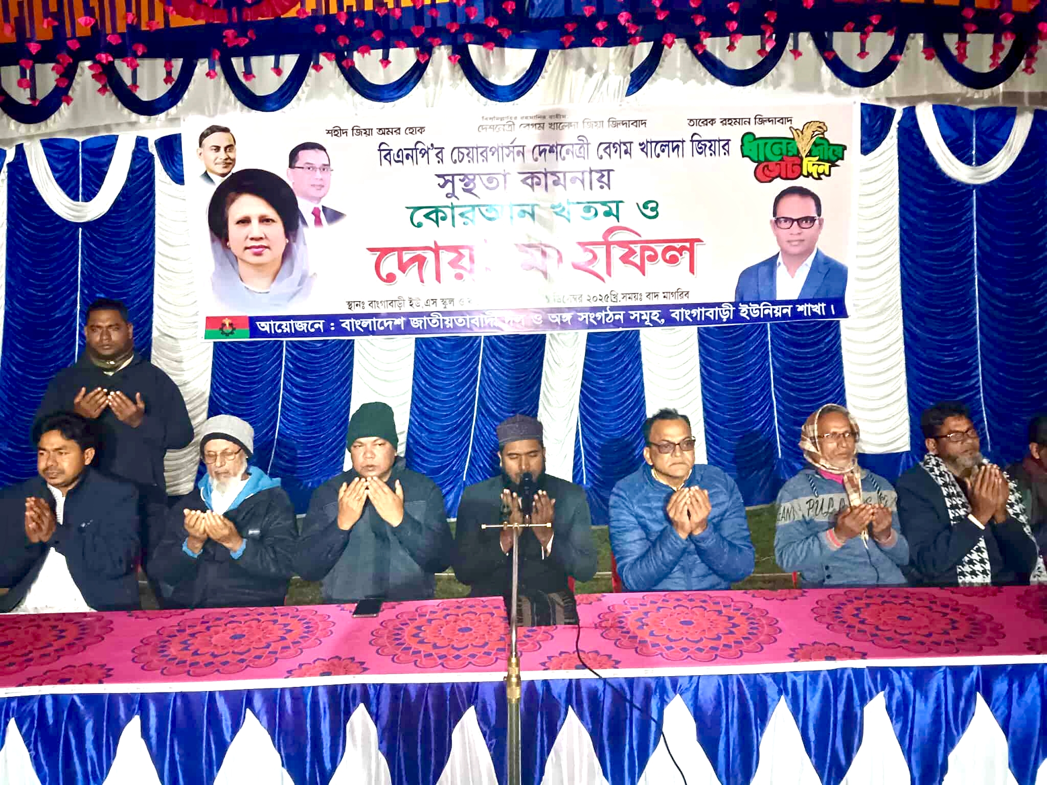ব্যুরো প্রধান,গোমস্তাপুর:চাঁপাইনবাবগঞ্জের গোমস্তাপুর উপজেলার বাংগাবাড়ি ইউনিয়ন বিএনপি ও অংগসংগঠনের আয়োজনে বাংগাবাড়ি স্কুল ও কলেজ মাঠে সোমবার সন্ধায় বিএনপি চেয়ারপার্সন সাবেক প্রধানমন্ত্রী বেগম খালেদা জিয়ায় রোগ মুক্তি কামনায় দোয়া খায়ের অনুষ্ঠিত হয়। দোয়া অনুষ্ঠানে মোবাইলের মাধ্যমে বক্তব্য রাখেন চাপাই নবাবগঞ্জ -২ আসনের সাবেক সংসদ সদস্য ও বিএনপির কেন্দ্রীয় কমিটির শিল্প ও বানিজ্য বিষয়ক সম্পাদক ধানের শীষের মনোনয়ন প্রাপ্ত আলহাজ্ব আমিনুল ইসলাম । এ সময়