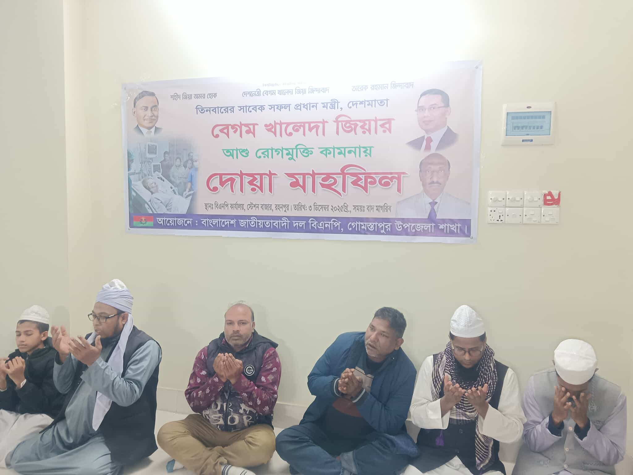 স্টাফ রিপোর্টার , গোমস্তাপুর:চাঁপাইনবাবগঞ্জের গোমস্তাপুর উপজেলার প্রাণকেন্দ্র রহনপুরে বিএনপি চেয়ারপার্সন সাবেক প্রধানমন্ত্রী বেগম খালেদা জিয়ার রোগমুক্তি কামনায় দোয়া মাহফিল ও আলোচনা সভা অনুষ্ঠিত হয়েছে।বুধবার সন্ধ্যায় স্টেশন বাজার তুহিন এর অফিসে জেলা বিএনপির সাবেক সাংগঠনিক সম্পাদক আব্দুস সালাম তুহিনের সমর্থনে বিএনপির নেতাকর্মীরা এসময় উপস্থিত ছিলেন, আলীনগর ইউনিয়ন বিএনপির যুগ্ম সাধারণ সম্পাদক,মনিরুল ইসলাম,সাবেক সভাপতি রহনপুর পৌর ৫ নং ওয়ার্ড বিএনপি শরিফ খান, সাধারণ সম্পাদক রহনপুর পৌর ৫নং ওয়ার্ড বিএনপি দেলোয়ার হোসেন রুবেল, বিএনপি নেতা, গাজিউল ইসলাম মিস্টু, দেলোয়ার হোসেন দুলাল, যুবনেতা রাসেল আলী বিএনপি নেতা ফিরোজ কবির,বিশিষ্ট ব্যবসায়ী সুমন আলীসহ বিএনপি ও অঙ্গ সহযোগী সংগঠনের নেতাকর্মীরা । দোয়া পরিচালনা করেন রহনপুর খাঁন আজহারুল উলুম ইসলামীয়া মাদ্রাসার প্রধান শিক্ষক মাওলানা মোঃ নুরুল আলম ।