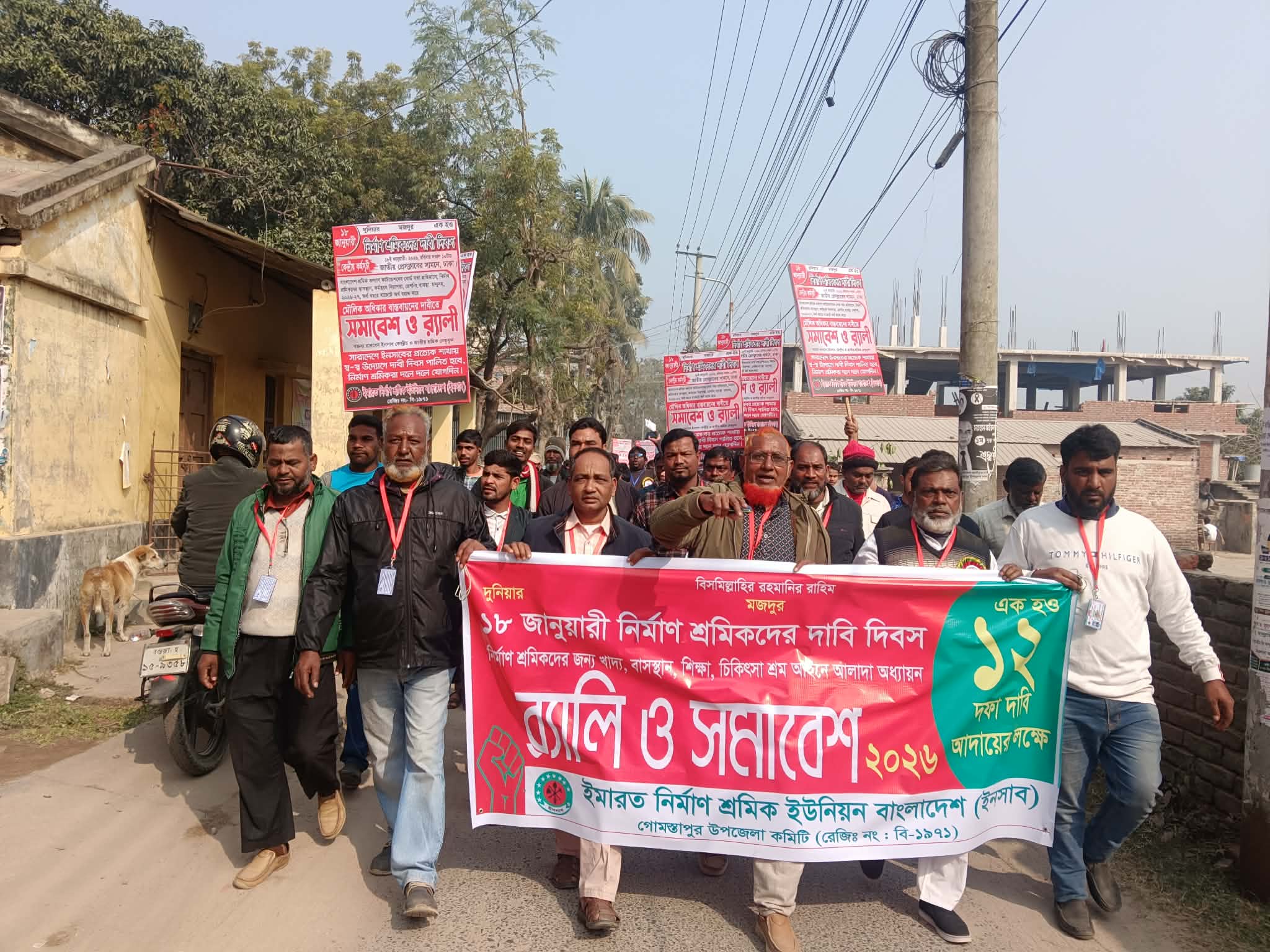 ব্যুরো প্রধান,গোমস্তাপুর: ইমারত নির্মাণ শ্রমিক ইউনিয়ন বাংলাদেশ( ইনসাব) গোমস্তাপুর উপজেলা শাখা আয়োজিত ১৮ জানুয়ারি রবিবার নির্মাণ শ্রমিকদের দাবি দিবস উপলক্ষে একটি বন্যার্ঢ র্যালী অনুষ্ঠিত হয়।