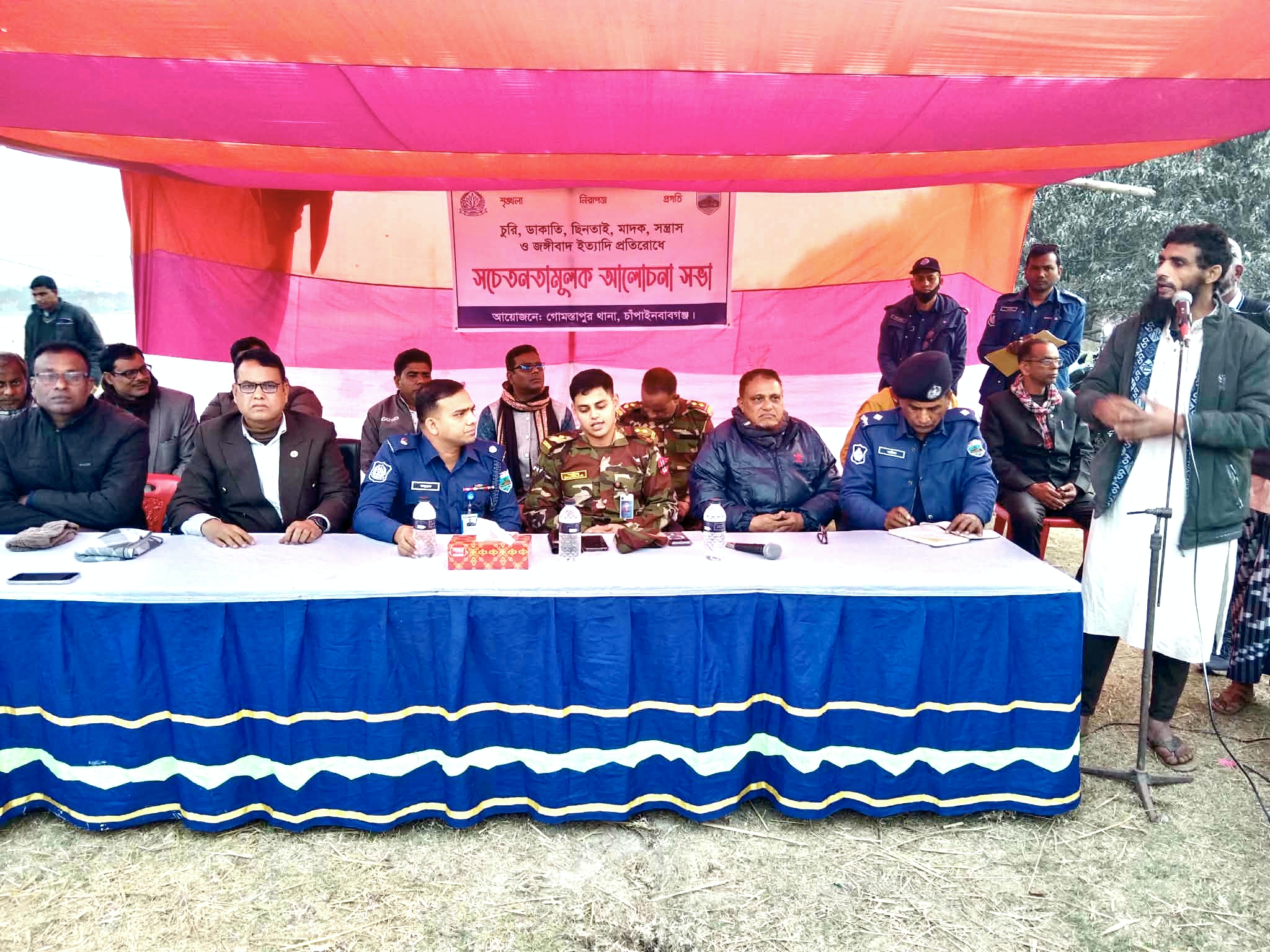 স্টাফ রিপোর্টার,গোমস্তাপুর:চাঁপাইনবাবগঞ্জের গোমস্তাপুর থানা পুলিশের আয়োজনে স্থানীয় ব্যক্তিদের নিয়ে সচেতনামূলক আলোচনা সভা অনুষ্ঠিত হয়েছে। রবিবার বিকেলে উপজেলার রহনপুর ইউনিয়নের বংপুর মোড়ে এই সভা অনুষ্ঠিত হয়। এতে পুলিশের পাশাপাশি সেনাবাহিনী কর্মকর্তা ও সদস্যরা উপস্থিত ছিলেন। সভায় চুরি,ডাকাতি,ছিনতাই, মাদক, সন্ত্রাস ও জঙ্গীবাদসহ অন্যান্য অপকর্ম প্রতিরোধ বিষয়ে আলোচনা করা হয়। এছাড়া রহনপুর-আড্ডা সড়কসহ উপজেলার অন্যান্য গুরুত্বপূর্ণ সড়কে রাতের বেলা বেশ কয়েকটি ডাকাতি ও ছিনতাই ঘটনাসহ মাদকদ্রব্য বিক্রি ও সেবনের পরিপ্রেক্ষিতে স্থানীয় জনসাধারণের সঙ্গে সতর্কমূলক প্রচারণা চালিয়ে যাচ্ছে গোমস্তাপুর থানা পুলিশ। সচেতনামূলক সভায় সভাপতিত্ব করেন গোমস্তাপুর থানার অফিসার ইনচার্জ (ওসি) আব্দুল বারিক। বক্তব্য দেন গোমস্তাপুর সার্কেলের অতিরিক্ত পুলিশ সুপার হাসান তারেক, গোমস্তাপুর উপজেলার দায়িত্বরত সেনা কর্মকর্তা লেফটেন্যান্ট শারার , উপজেলা প্রেসক্লাবের সভাপতি আতিকুল ইসলাম আজম, সাবেক পুলিশ কর্মকর্তা ইসমাইল হোসেন, রহনপুর ইউপি সদস্য খলিলুর রহমানসহ স্থানীয় ব্যক্তিরা। এ সময় স্থানীয় লোকজন আইনশৃঙ্খলা রক্ষায় বিভিন্ন প্রশ্ন করেন।