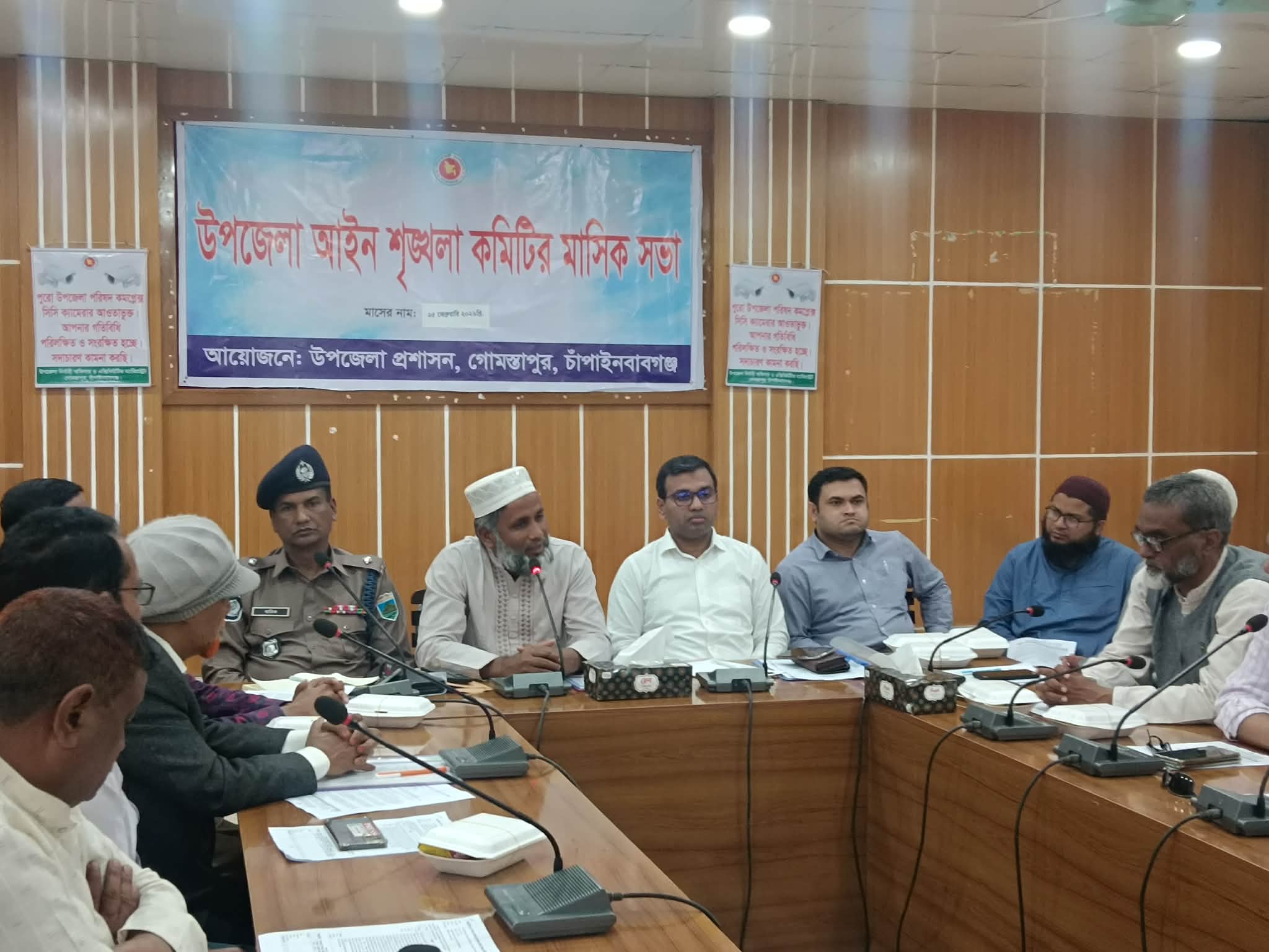 বক্তব্য রাখেন চাঁপাইনবাবগঞ্জ জেলা মাধ্যমিক শিক্ষা অধিদপ্তরের উপপরিচালক (ভারপ্রাপ্ত) আব্দুল মতিন,গোমস্তাপুর থানার অফিসার ইনচার্জ আব্দুল বারিক,কৃষি কর্মকর্তা সাকলাইন হোসেন, উপজেলা আনসার ভিডিবি কর্মকর্তা ফরহাদ আলম চৌধুরী, পার্বতীপুর ইউনিয়ন পরিষদের চেয়ারম্যান মোয়াজ্জেম হোসেন,রহনপুর ইউনিয়ন চেয়ারম্যান মনিরুজ্জামান সোহরাব, আলীনগর চেয়ারম্যান আবুল কাসেম মোহাম্মদ মাসুম, বিজিবি রহনপুর কোম্পানি কমান্ডার আতিকুর রহমান, ফায়ার সার্ভিস সিভিল ডিফেন্স গোমস্তাপুর ইনচার্জ মুহাতাব আলী, চৌডালা ইউনিয়ন চেয়ারম্যান গোলাম কিবরিয়া হাবিব, রাধানগর চেয়ারম্যান মতিউর রহমান, বোয়ালিয়া চেয়ারম্যান শামিউল আলম শ্যামল, গোমস্তাপুর উপজেলা প্রেসক্লাব সভাপতি নূর মোহাম্মদ , রহনপুর রিপোর্টাস ক্লাব সভাপতি নাহিদ ইসলাম, উপজেলা স্বাধীন প্রেসক্লাব সভাপতি আলাউদ্দিন পারভেজ , সাধারণ সম্পাদক আমিনুল ইসলাম প্রমূখসহ উপজেলার সকল দপ্তরের প্রধানগণ, প্রিন্ট ও ইলেকট্রিক মিডিয়ার সাংবাদিকবৃন্দ। মাসিক সভায় আইন শৃঙ্খলাসহ উপজেলার সার্বিক বিষয়ে আলোচনা ও পদক্ষেপ গ্রহণের বিষয়ে আলোচনা করা হয়।