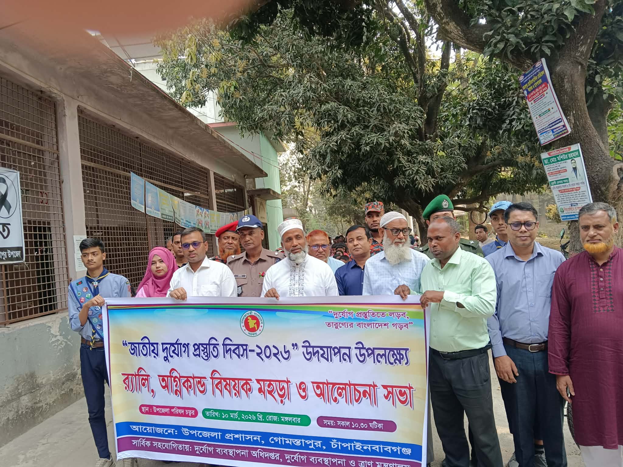 ব্যুরো প্রধান,গোমস্তাপুর ঃ জাতীয় দুর্যোগ প্রস্তুতি দিবস উদযাপন উপলক্ষে র্যালী অগ্নিকাণ্ড বিষয়ক মহড়া ও আলোচনা সভা অনুষ্ঠিত হয়। মঙ্গলবার সকাল১০ টায় একটি র্যালী উপজেলা চত্বর থেকে বের হয়ে বিভিন্ন সড়ক প্রদক্ষিন শেষে সভাকক্ষে আলোচনা সভা অনুষ্ঠিত হয়। সভায় সভাপতিত্ব করেন উপজেলা নির্বাহী অফিসার জাকির মুন্সি। প্রধান অতিথি ছিলেন জাতীয় সংসদ সদস্য ড. মুঃ মিজানুর রহমান। বক্তব্য রাখেন সহকারী কমিশনার (ভুমি) উম্মে সালমা রুমা, অফিসার ইনচার্জ আব্দুল বারিক, উপজেলা প্রকল্প বাস্তবায়ন অফিসার আব্দুল আলিম, ফায়ার সার্ভিস সিভিল ডিফেন্স গোমস্তাপুর ইনচার্জ মুহাতাব আলী, পার্বতীপুর ইউনিয়ন পরিষদের চেয়ারম্যান মোয়াজ্জেম হোসেন, উপজেলা প্রেসক্লাব সভাপতি আতিকুল ইসলাম আজম প্রমুখ।