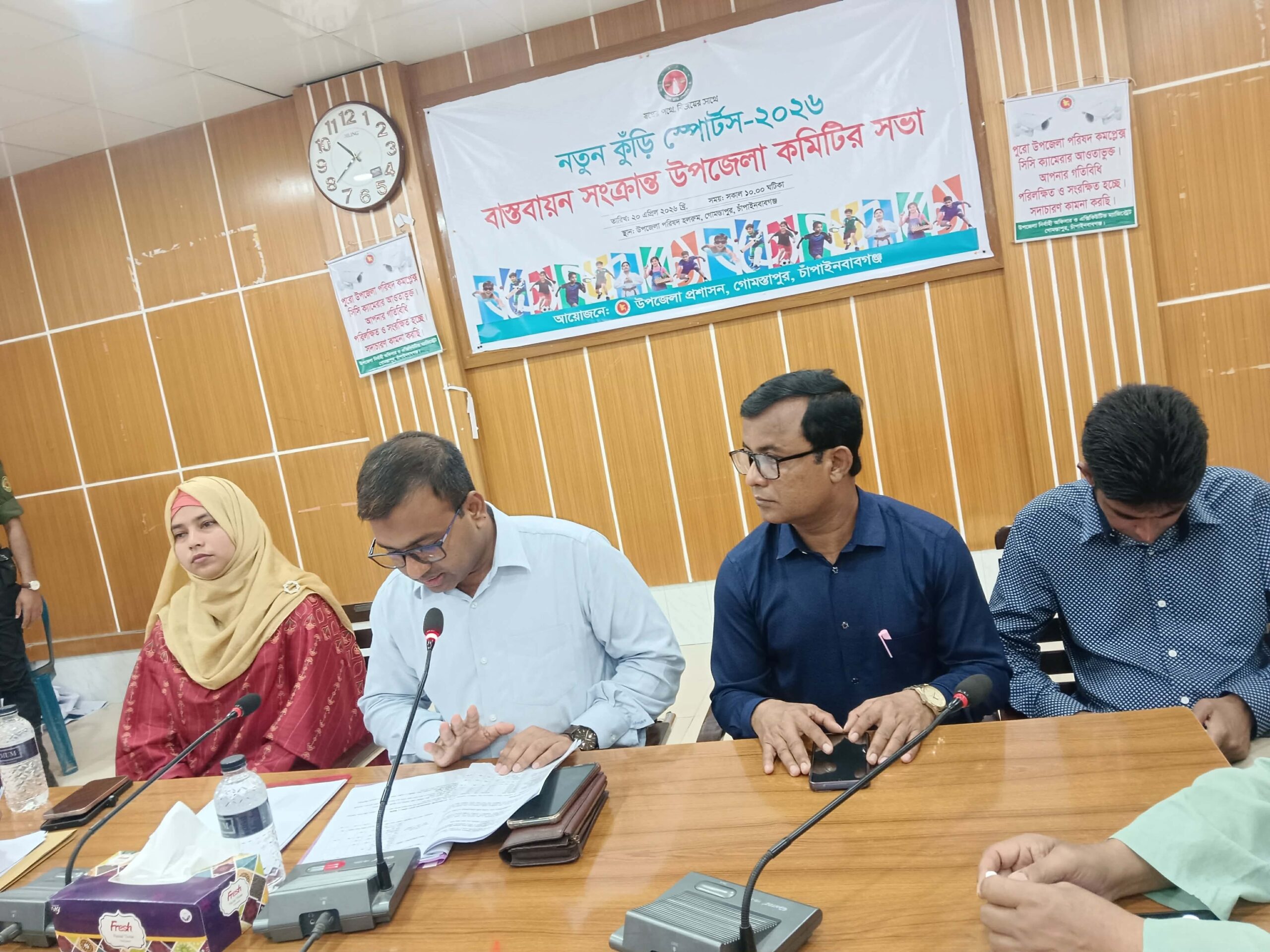 ব্যুরো প্রধান,গোমস্তাপুর:গোমস্তাপুর উপজেলায় যুব ও ক্রীড়া মন্ত্রণালয়ের অধীনে ক্রীড়া পরিদপ্তরের আওতায় নতুনকুঁড়ি স্পোর্টস ২০২৬ বাস্তবায়ন সংক্রান্ত উপজেলা কমিটির সভা অনুষ্ঠিত হয়েছে । সোমবার উপজেলা সভা কক্ষে সকাল দশ টায় উপজেলা প্রশাসনার আয়োজনে সভায় সভাপতিত্ব করেন উপজেলা নির্বাহী অফিসার জাকির মুন্সি। এ সময় উপস্থিত ছিলেন সহকারী কমিশনার ভুমি উম্মে সালমা রুমা, উপজেলা শিক্ষা অফিসার ইছাহাক আলি, উপজেলা স্বাস্থ্য ও পরিবার পরিকল্পনা অফিসার ডাঃ আব্দুল হামিদ, পার্বতীপুর ইউনিয়ন পরিষদের চেয়ারম্যান মোয়াজ্জেম হোসেন